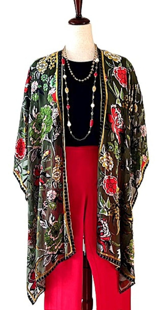 Floral Velvet Burnout Kimono: Polka Dot Border, One Size