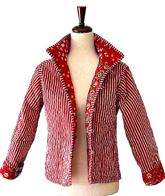 Fully Reversible Short Quilted Jacket With Kantha Stitching. (Red)