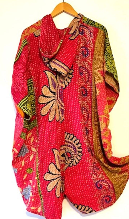 Kantha Bae Knee Length Poncho Coat (Pink with Green)