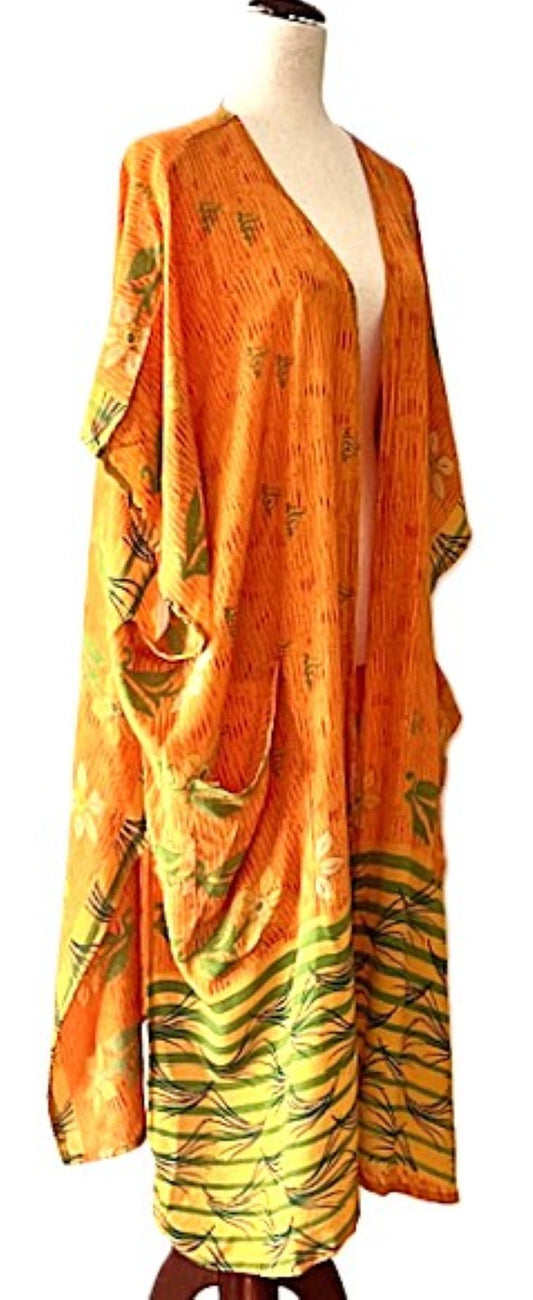 Kantha Bae Cotton Sari Kimono, Fully Reversible. (Yellow Floral)