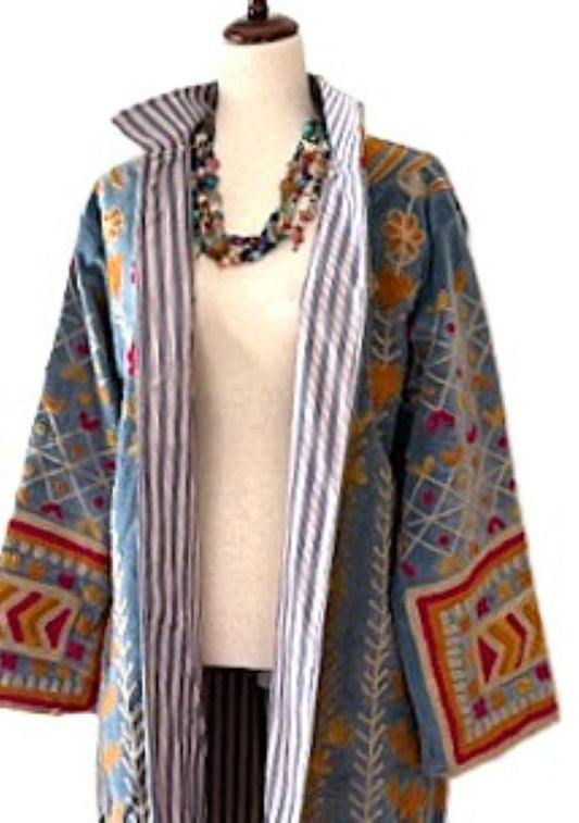 Jacket - Wearable Art, Hand Embroidered Kimono Coat (Blue)