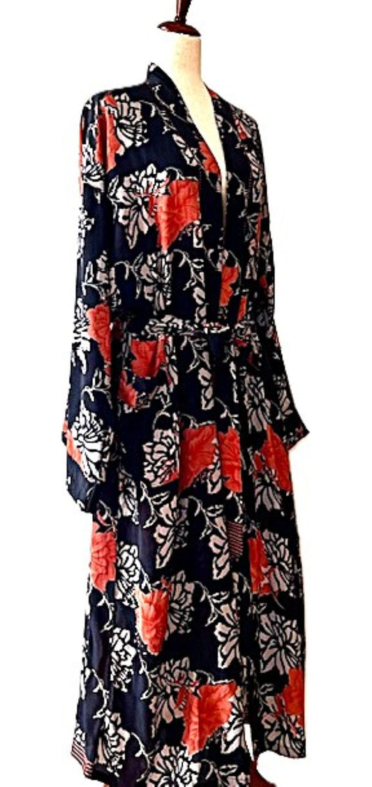 Long Silk Kimono Duster, Dramatic Red Floral Against A Black Background