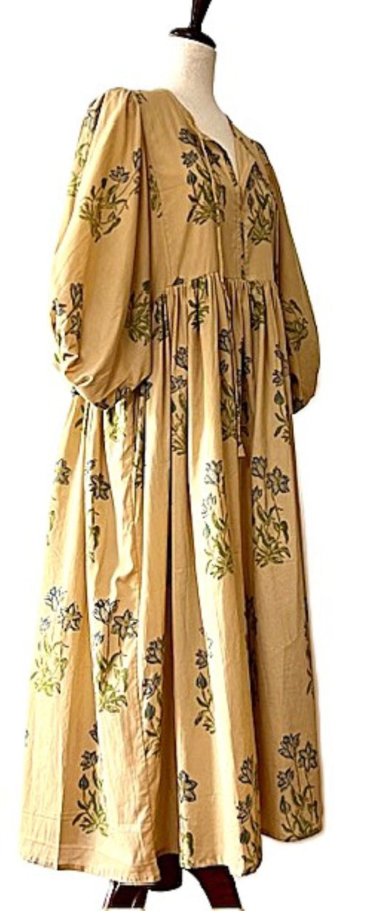 Dresses: Smart Floral Cotton Handblock Midi. Unusual and Seasonless.(Mustard)