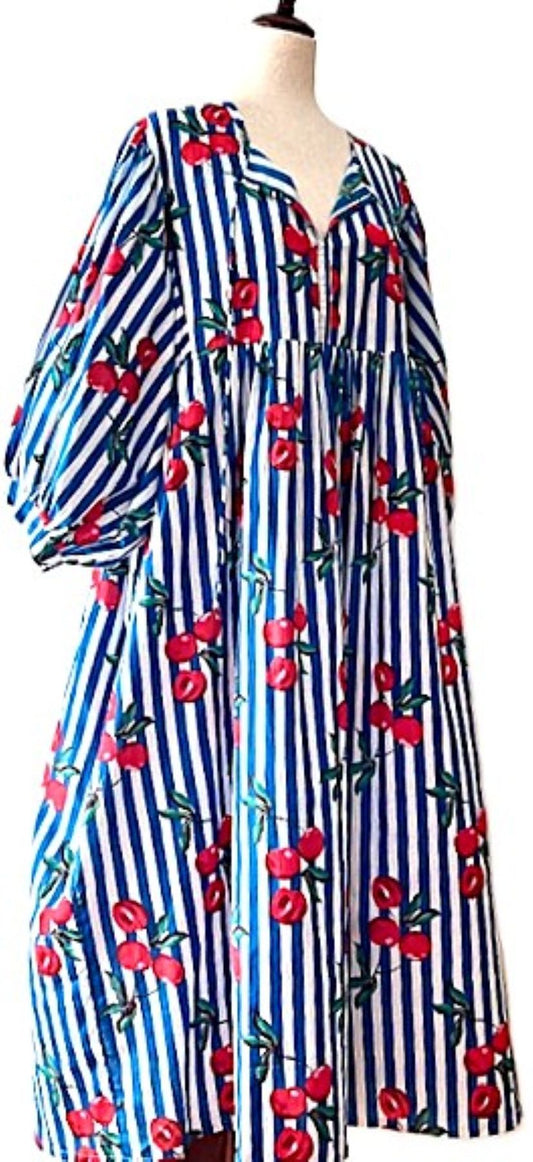 Dresses: Smart Striped Cotton Handblock Midi With Cherries. Cute. (Navy)