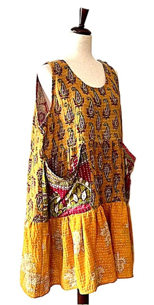 Kantha Bae Quilted Meadow Mini Dress. Comfortable Chic (Green Gold)