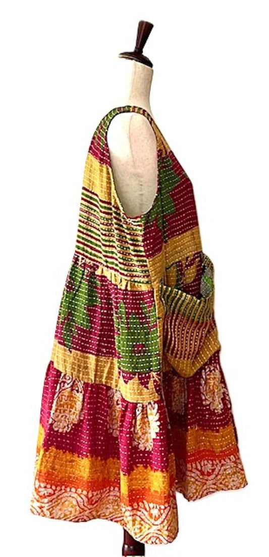 Kantha Bae Quilted Meadow Mini Dress. Comfortable Chic (Red, Green)