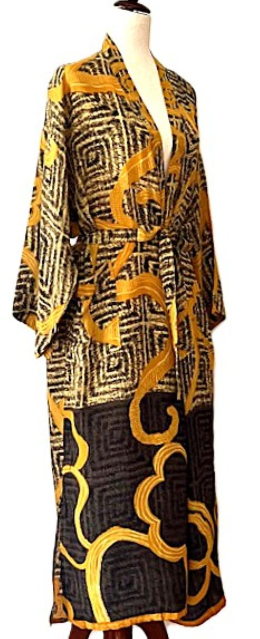 Long Silk Kimono Duster, Abstract Print That Will Draw Attention. (Black Gold)