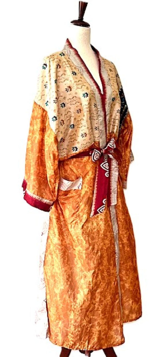 Long Silk Mixed Print Kimono Duster Is Feminine And Demure (Apricot)