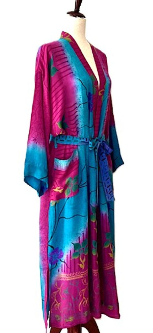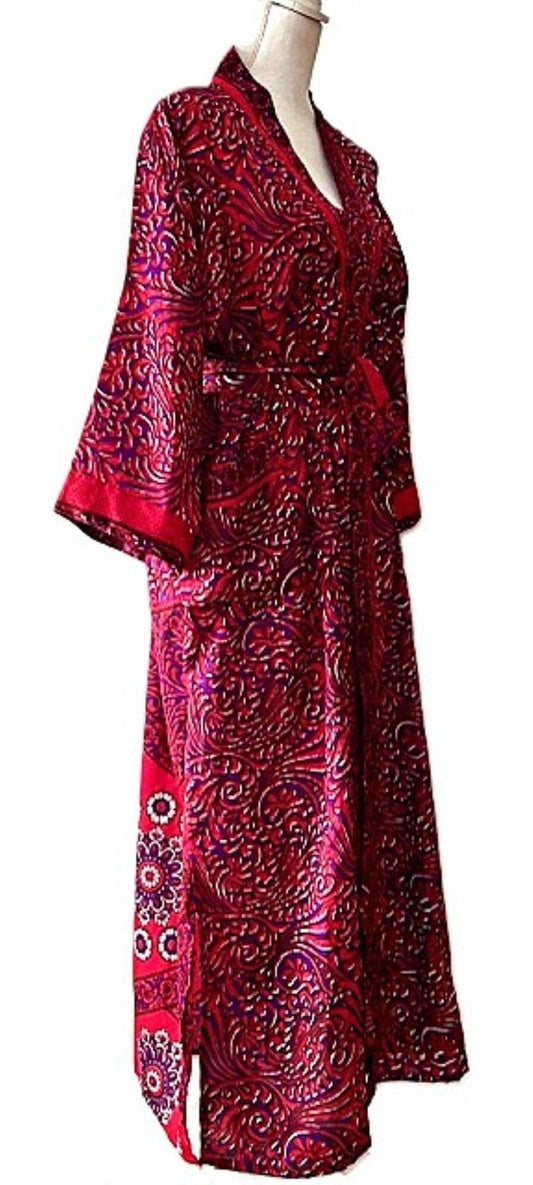 Long Silk Kimono Duster, Elegant Complex Mixed Print And Elegant (Raspberry)