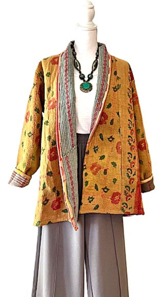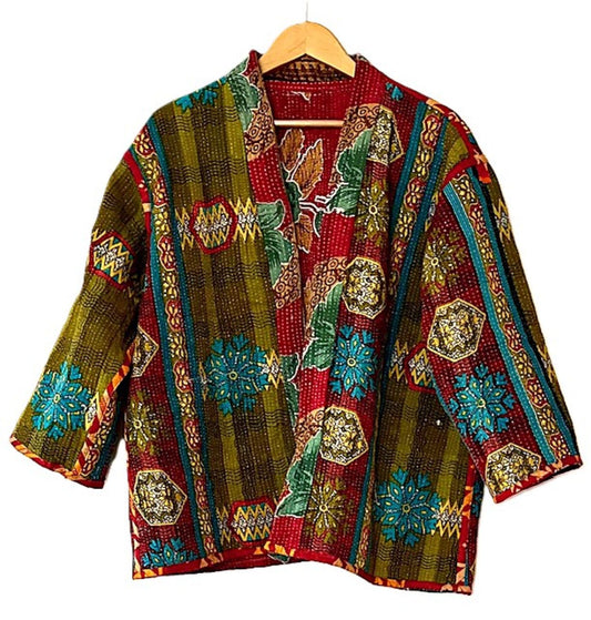 Fully Reversible Short Quilted Jacket With Kantha Stitching. (Red)