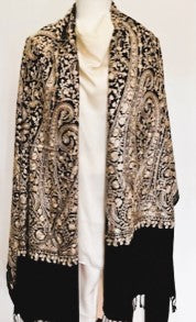 Tanaya Embroidered Wool Shawl. Collector's shawl. Black & Metallic