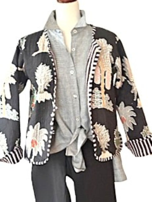 Fully Reversible Cotton Quilted Botanical Print Jacket. (Black )
