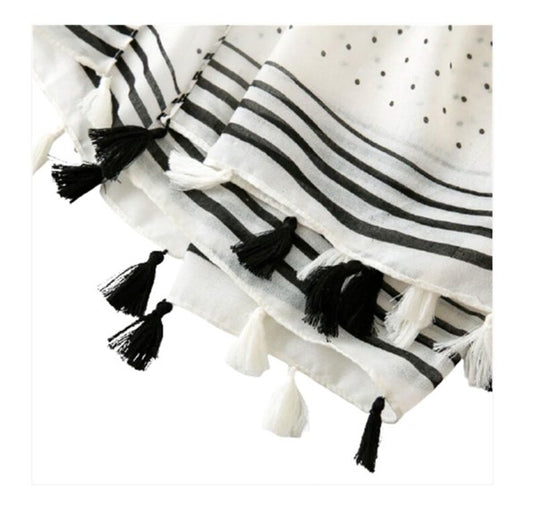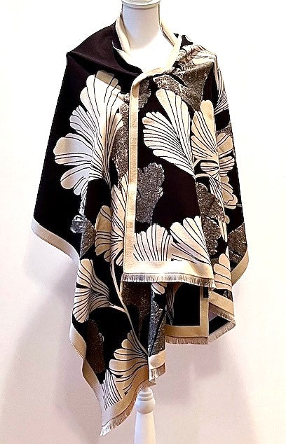 Black Cream Large Gingko Print Reversible Wrap - Artisan Shawl