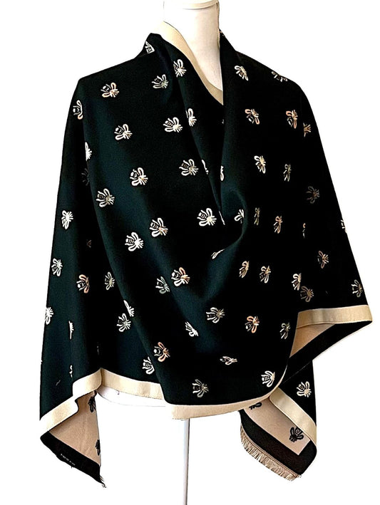 Cream and Black Bees Reversible Wrap – Artisan Shawl.