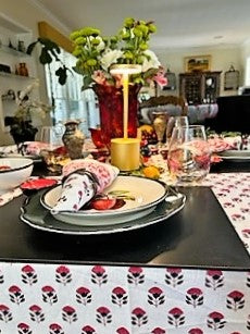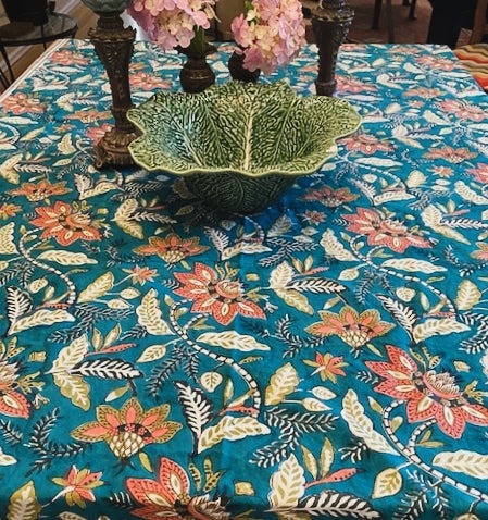 Dramatic Block Print Floral Tablecloth is On Trend. Bold, Strong Colors. (60 X 90)