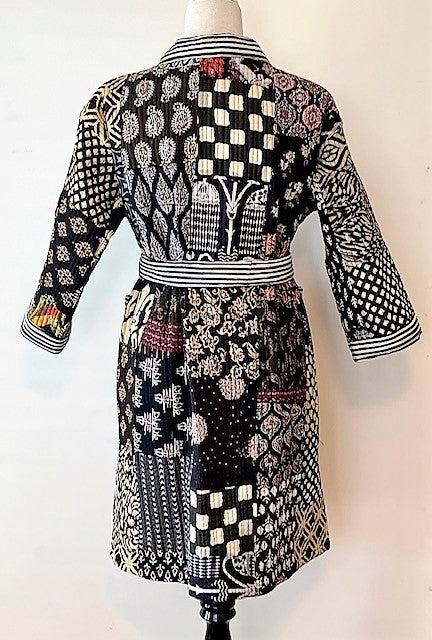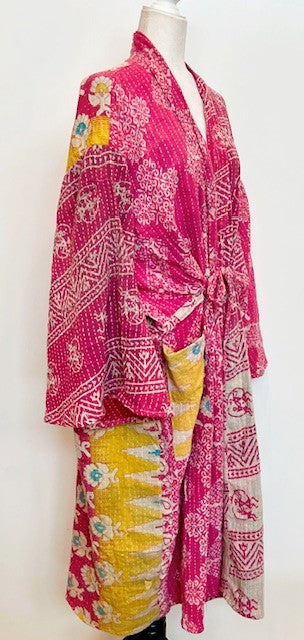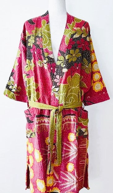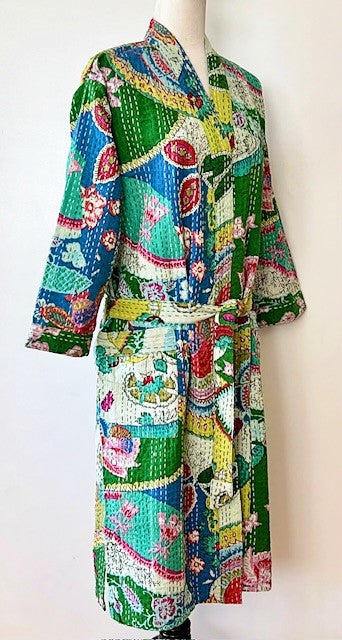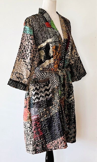 Patchwork Multicolor Silk Kantha Quilted Kkimono. Artisan