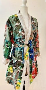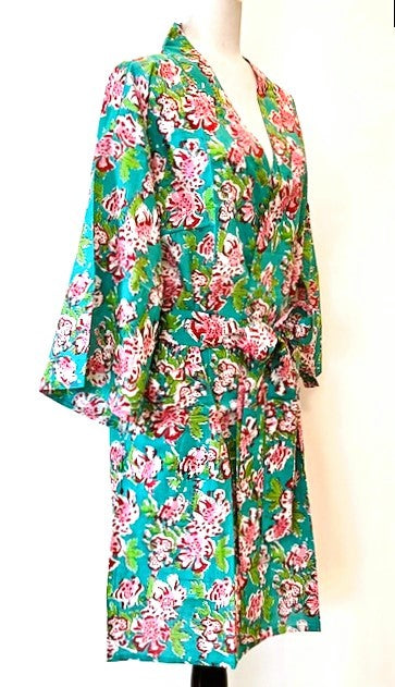 Short Floral Block Print Cotton Kimono Robe. A Kaleidoscope of Color.