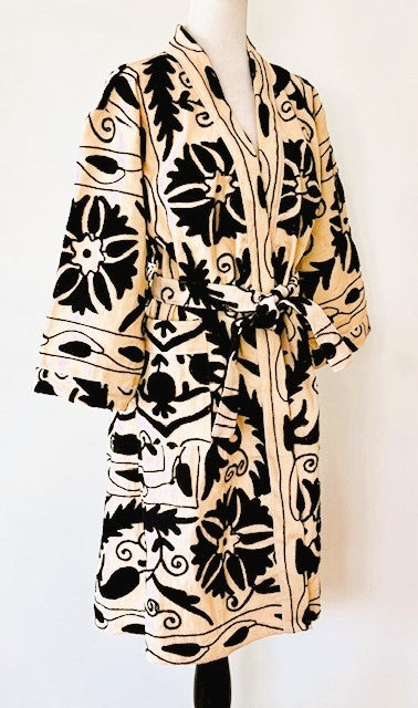 Classic Beige and Black New Suzani Kantha Quilted Jacket. Sophisticated