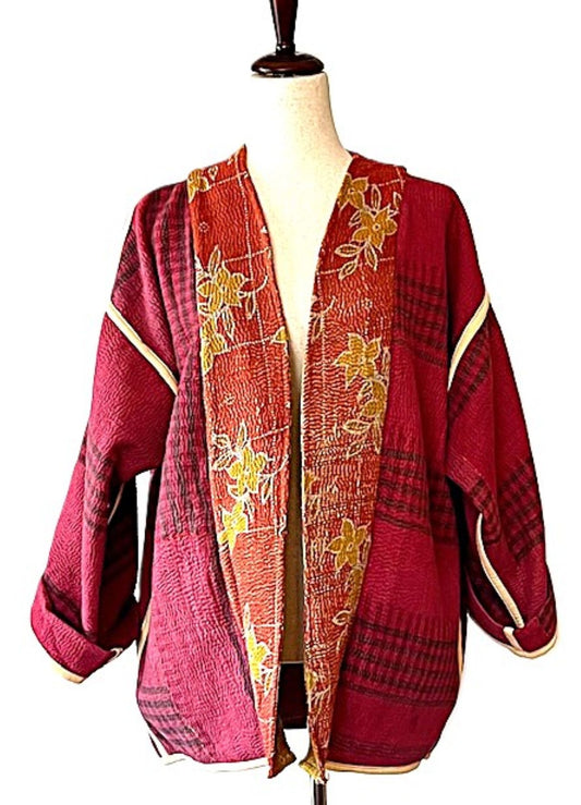 Beautiful Vintage Short Floral Kantha Jacket. (Raspberry)