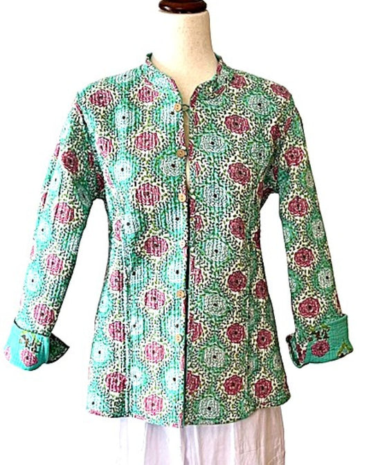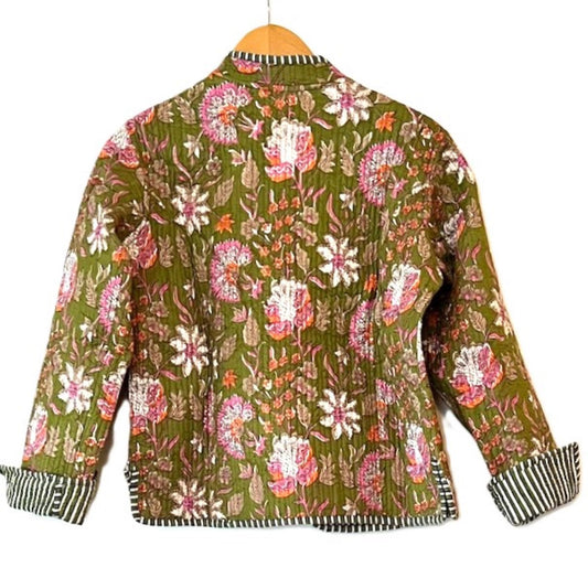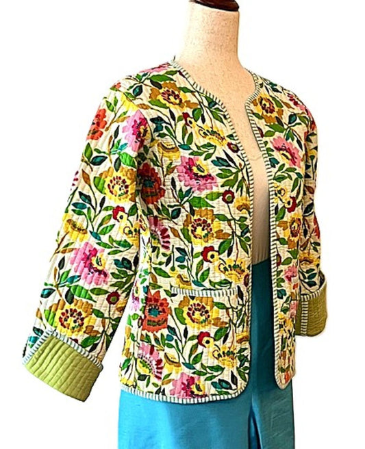 Luxe Cotton Quilted Handmade Open Jacket, (Green Florals)