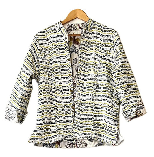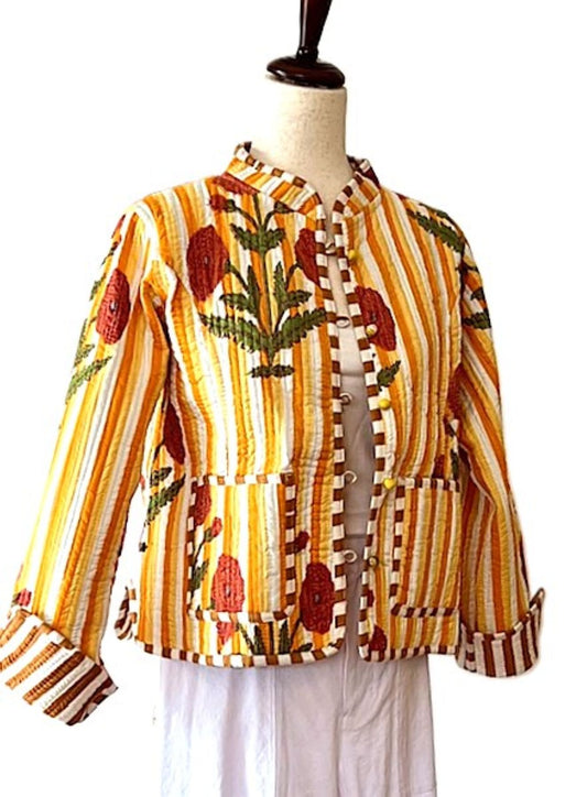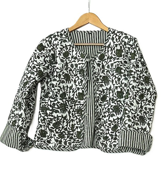 Short Cotton Quilted Handmade Jacket, Fully Reversible. (Striped Floral)