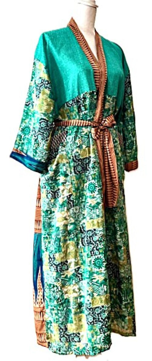 Luxurious Mixed Print Silk Kimono Duster. (Emerald)