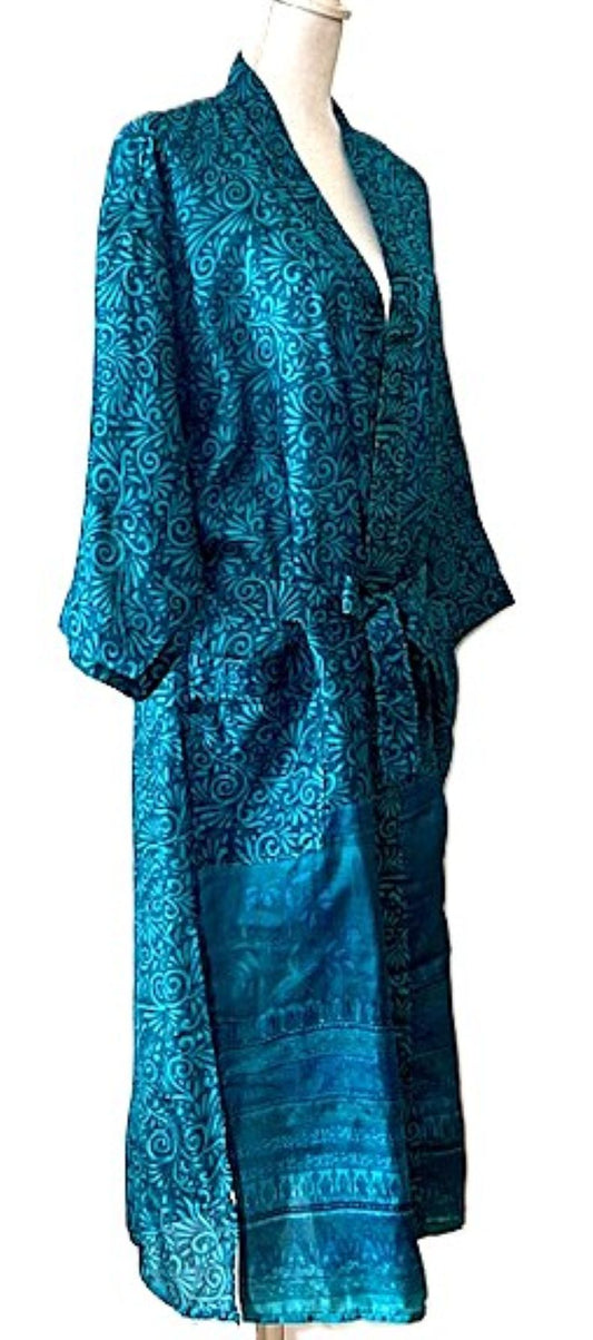 Luxurious Rich Silk Long Kimono Duster. Glamorous (Turquois)