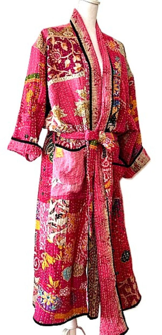 Long Patchwork Cotton Kimono With Kantha Embroidery. Pink