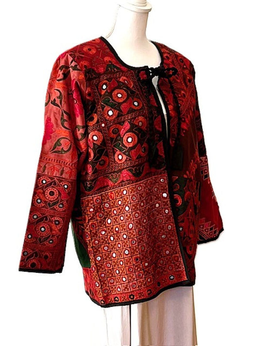 Elaborate Hand Embroidered Jacket With Embellishment And Neck Tie. (Red)