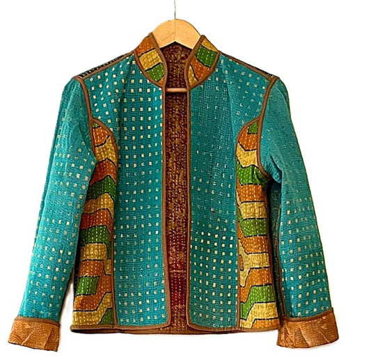Fully Reversible Short Quilted Jacket With Kantha Stitching. Beautiful Color.