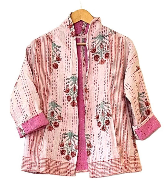 Kantha Quilted Short Handmade Cotton Jacket With Border (Pink)