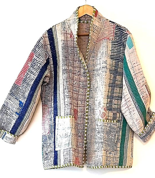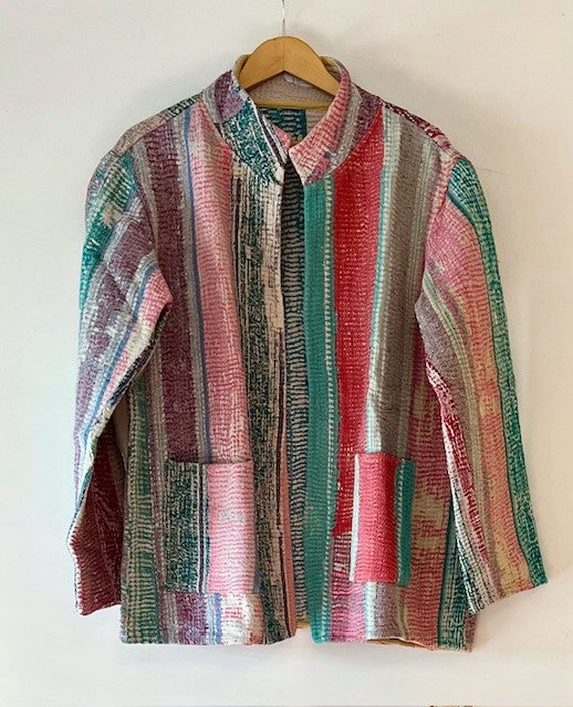 Handmade Indian Vintage Cotton Kantha Jacket, Reversible Multi Stripe
