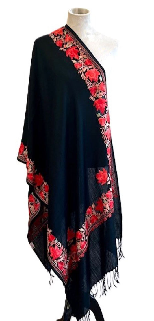 Taj Embroidered Wool Shawl. Embroidered Border. Black with Red