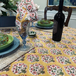 Hazel Block Print Floral Table Cloth Is Bright and Fresh (Gold and Pink)