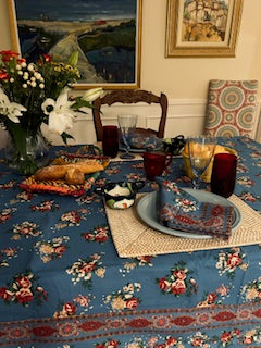 Dramatic Block Print Floral Tablecloth Is On Trend. Bold Deep French Blue.