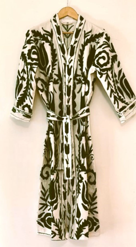 Winter Warm Coat For Women, Suzani Hand Embroidered Long Kimono. (Green)