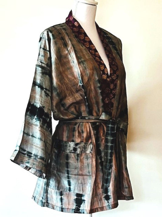 The Accessory In Demand, A Short Silk Kimono Jacket. A Tie Dye Beauty In Silver.