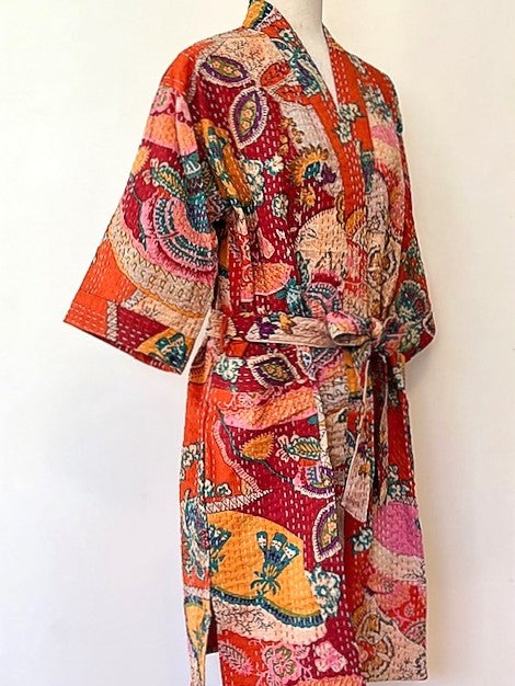 Short Patchwork Cotton Kimono With Kantha Embroidery Celebrates Life (Orange)