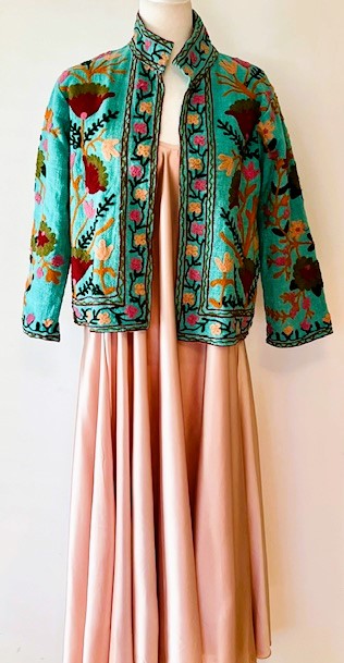 Short Box Cut Suzani Hand Embroidered Jacket In Jade.