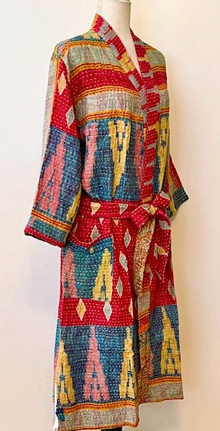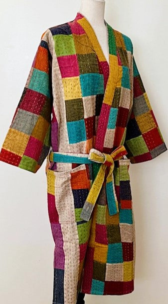 Patchwork Multicolor Silk Kantha Quilted Kkimono. Artisan