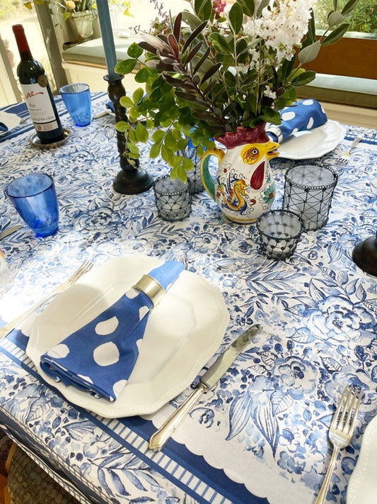 Floral Watercolor Print Tablecloth With Specialty Border in Blue and White