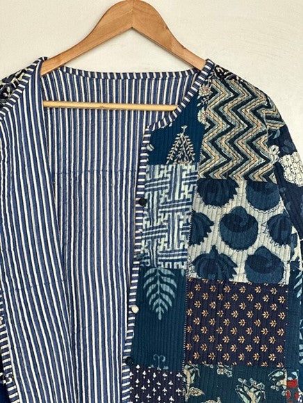 New Generation of Kantha: Print Reversible Jacket With Pockets (NavyWhite Ikat)
