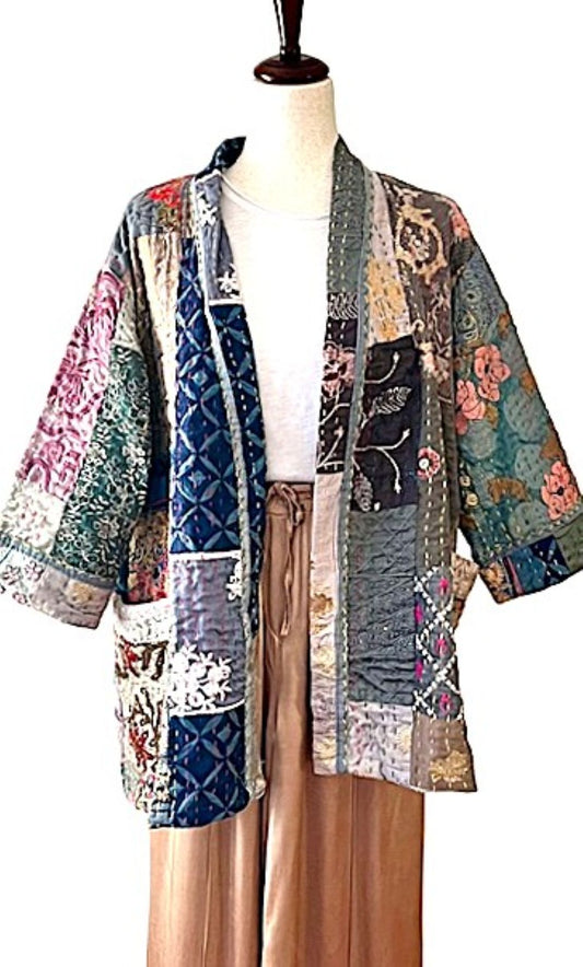 Lightweight Kantha Embroidery Mixed Print Kimono. Complex Print (Royal Blue )