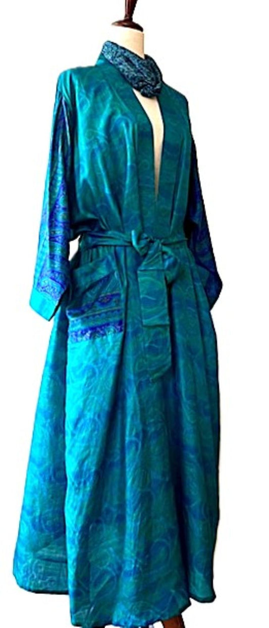 Luxurious Rich Silk Long Kimono Duster. Glamorous (Turquoise)