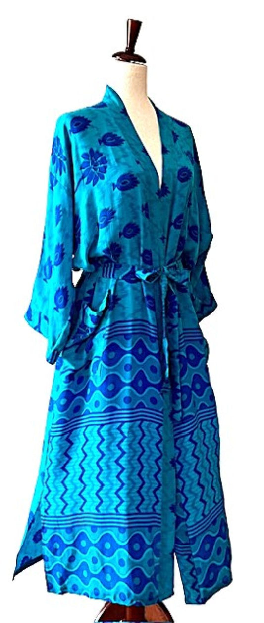 Luxurious Rich Silk Long Kimono Duster. Glamorous (Blue Floral)