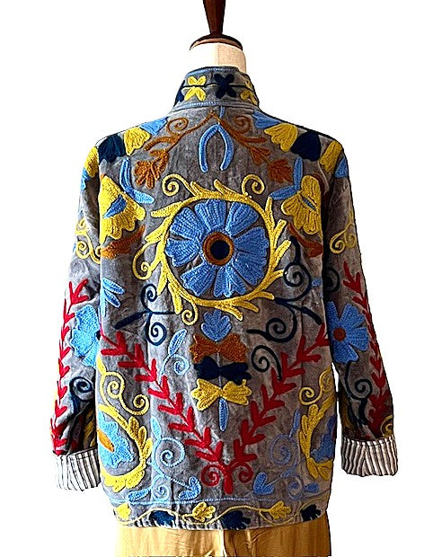 Jacket, Handmade Suzani Velvet Fully Reversible Jacket: Embroidered Folk Art (Gray)
