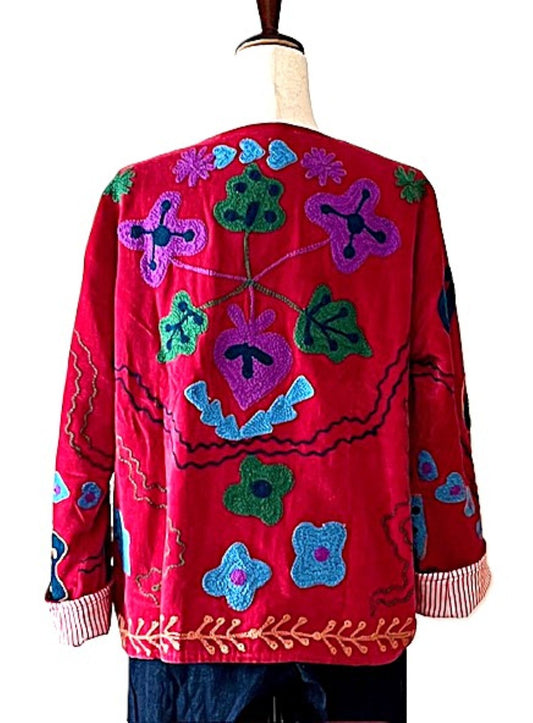 Jacket, Handmade Suzani Velvet Fully Reversible Jacket: Embroidered Folk Art Coat(Red)