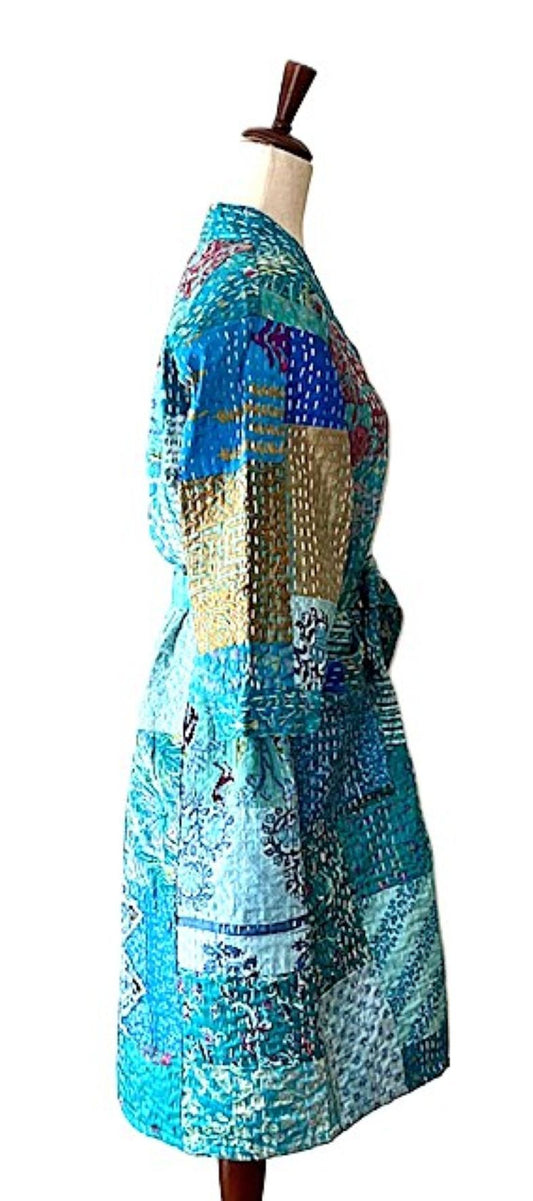 Quilted Silk Kantha Kimono Patchwork Duster. Multicolor. (Turquoise)