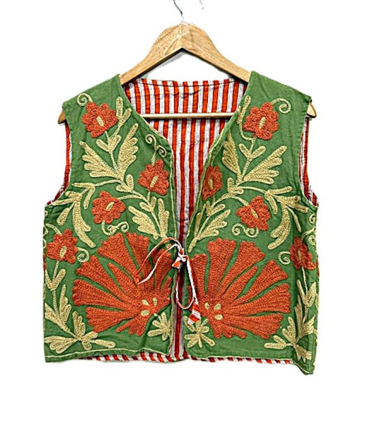 Fully Reversible Designer Handmade Embroidered Vest. Looks Smart (Green Red)