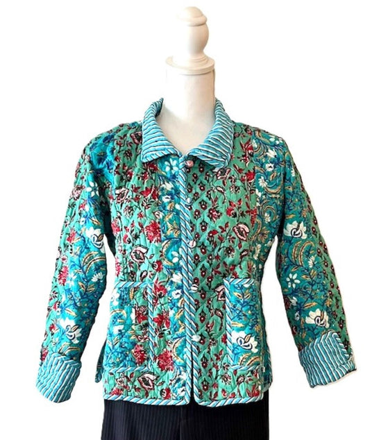 Luxe Cotton Quilted Handmade Open Jacket, (Green Florals)